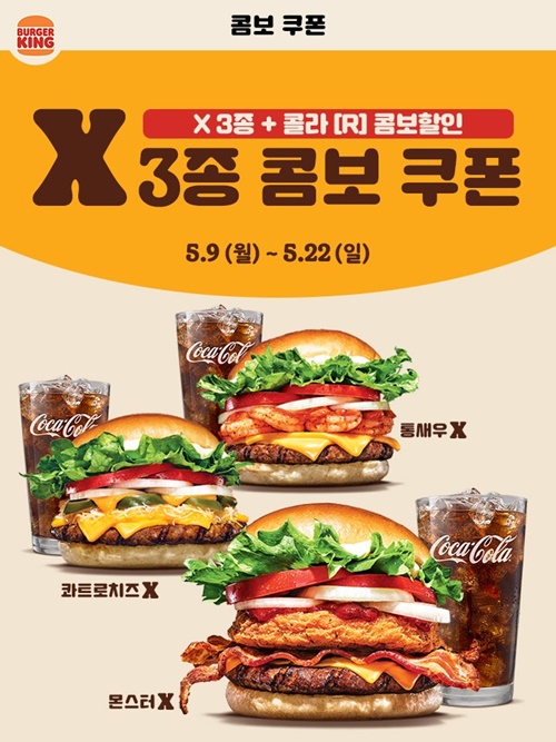 통새우X, 콰트로치즈X, 몬스터X 시리즈는 음료를 무료로 주는 콤보 쿠폰을 나눠주고 있습니다. 이 3종의 버거는 단품 가격이 만만치 않거든요. 그래서 이렇게 콤보쿠폰으로라도 먹어줘야 그나마 조금 가격이 착하구나 싶어집니다.