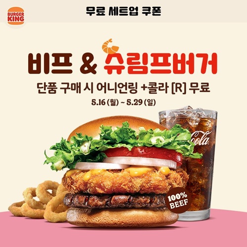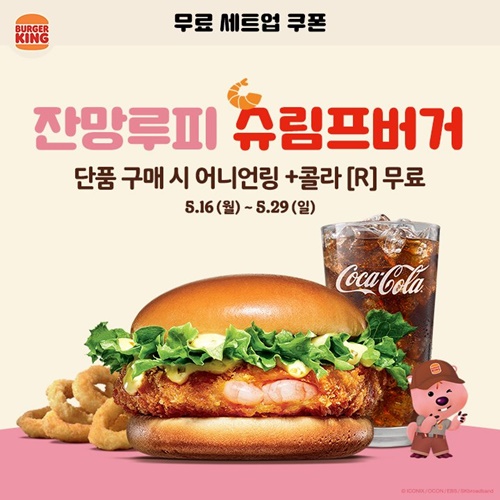 잔망루피 슈림프버거, 통새우 슈림프버거, 비프&슈림프버거를 무료 세트업 시킬 수 있는 쿠폰을 줍니다. 슈림프버거는 어니언링을 기본으로 제공해 주는 세트업이네요.