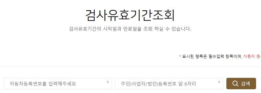 자동차등록번호와 주민등록번호 또는 사업자/법인 등록번호를 입력하고 '검색'을 누르면 바로 결과가 나옵니다.